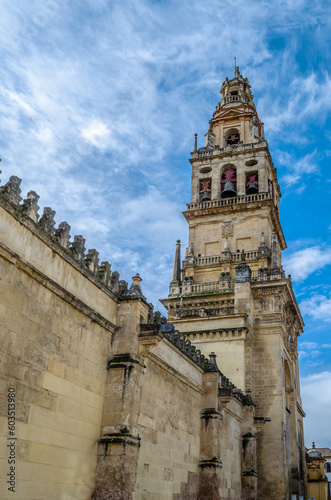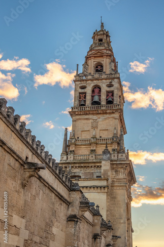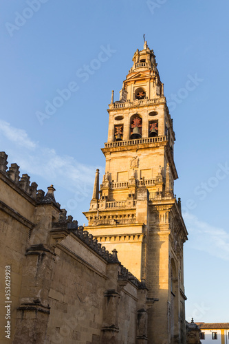 Bell tower of mosque-cathedral of Cordoba at sunset. Original Muslim minaret this structure has played an important role in the image and profile of Cordoba  Andalusia  Spain
