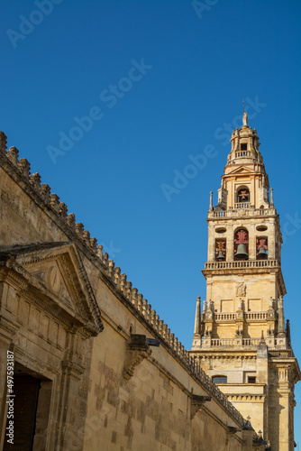bell tower of a church illuminated by the morning sun on a clear day  stone building  old architecture of the city of Cordoba